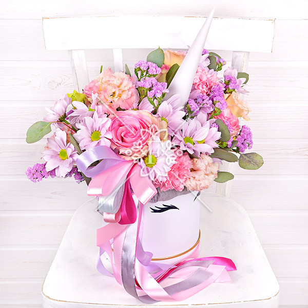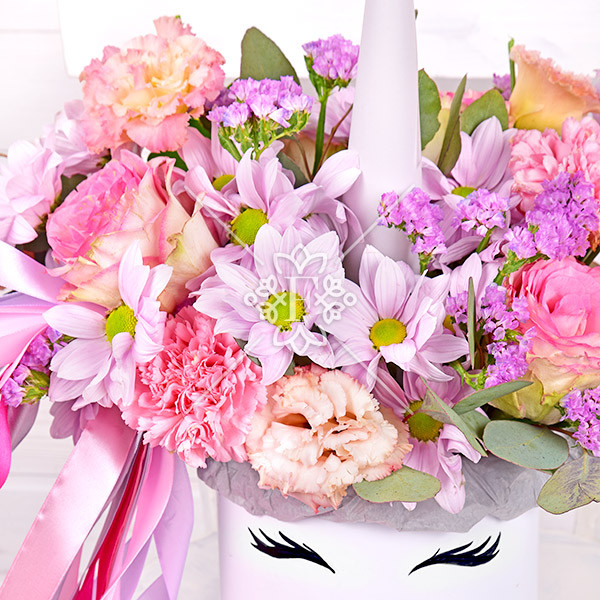 Словно волшебный единорог с роскошной гривой из роз, хризантем, гвозик, эустомы и статицы, эта цветочная композиция подарит сказочно-прекрасное настроение, искренний восторг и веру в чудеса!  Фиолетово-розовая гамма, нежность лепестков и  очарование бутонов  никого не оставят равнодушным!